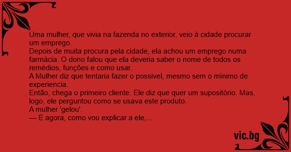 Então, chega o primeiro cliente. Ele diz que quer um supositório. Mas, logo, ele perguntou como se usava este produto.