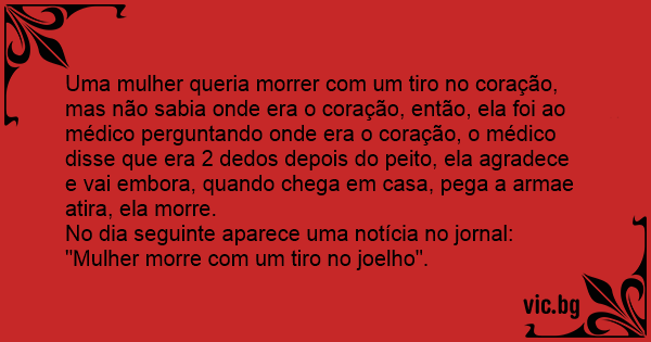 Uma mulher queria morrer com um tiro no coração, mas não sabia onde era o coração, então, ela foi ao médico perguntando onde era o coração, o médico disse que era 2 dedos depois do peito, ela agradece e vai embora, quando chega em casa, pega a armae atira, ela morre.