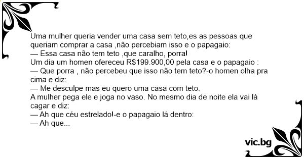 Uma mulher queria vender uma casa sem teto,es as pessoas que queriam comprar a casa ,não percebiam isso e o papagaio: