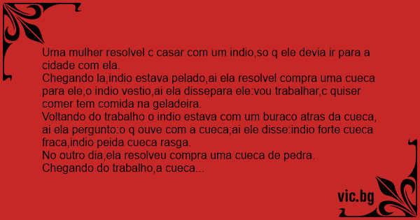 Voltando do trabalho o indio estava com um buraco atras da cueca, ai ela pergunto:o q ouve com a cueca;ai ele disse:indio forte cueca fraca,indio peida cueca rasga.
