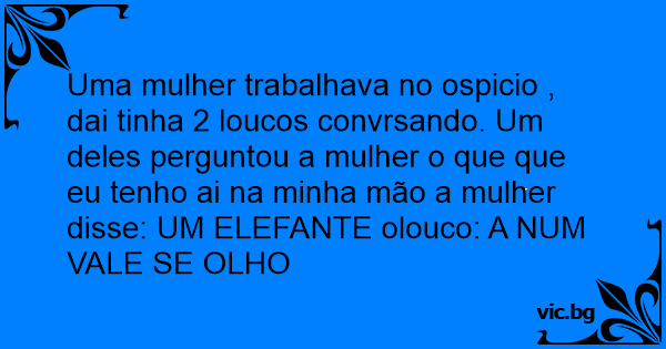 Uma mulher trabalhava no ospicio , dai tinha 2 loucos convrsando. Um deles perguntou a mulher o que que eu tenho ai na minha mão a mulher disse: UM ELEFANTE olouco: A NUM VALE SE OLHO