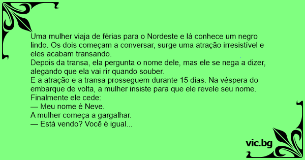 Uma mulher viaja de férias para o Nordeste e lá conhece um nеgrо lindo. Os dois começam a conversar, surge uma atração irresistível e eles acabam transando.