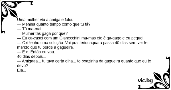 — Oxi tenho uma solução. Vai pra Jeriquaquara passa 40 dias sem ver teu marido que tu perde a gagueira.