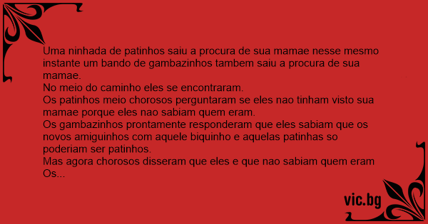Mas agora chorosos disseram que eles e que nao sabiam quem eram Os patinhos prontamente responderam que fedorentos daquele jeito e branco e preto so poderiam ser corintianos