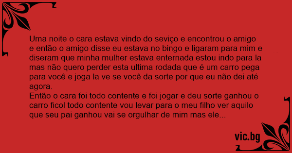 Uma noite o cara estava vindo do seviço e encontrou o amigo e então o amigo disse eu estava no bingo e ligaram para mim e diseram que minha mulher estava enternada estou indo para la mas não quero perder esta ultima rodada que é um carro pega para você e joga la ve se você da sorte por que eu não dei até agora.