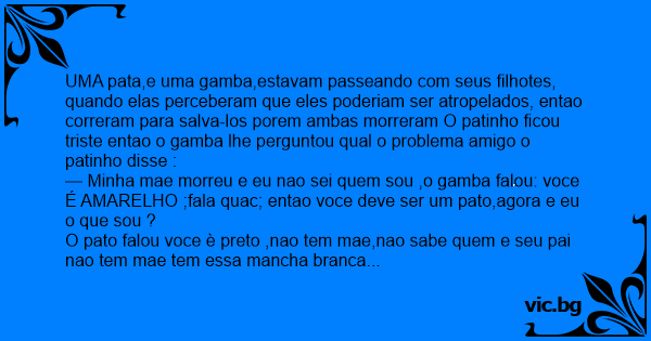 — Minha mae morreu e eu nao sei quem sou ,o gamba falou: voce É AMARELHO ;fala quac; entao voce deve ser um pato,agora e eu o que sou ?