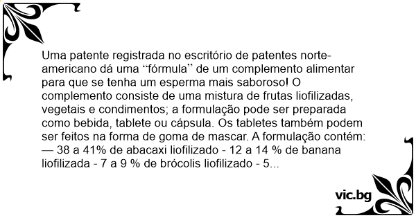 — 38 a 41% de abacaxi liofilizado - 12 a 14 % de banana liofilizada - 7 a 9 % de brócolis liofilizado - 5 a 7 % de aipo liofilizado - 5 a 7% de morango ou cereja liofilizada - 5 a 7% de canela - até 1143mg de cálcio - 400mg de magénio - 1,2 a 2 % de gengibre - 1,2 a 2% de noz-moscada - até 200mg de creatina - até 100mg de zinco - até 30mg de selênio - até 6mg de vitamina E - até 2,5mg de vitamina B6 - até 0,5mg de vitamina B12 O texto da patente alega que essa mistura melhora o sabor da ejac*ulação e que certos ingredientes já tinham uma crendice anterior de terem efeitos no gosto do esperma e que então теsтеs mais aprofundados resultaram na receita descrita acima. O responsável pela patente também afirma que toda a pesquisa de desenvolvimento durou mais de um ano e que outro ano foi necessário para fazer investigações adicionais quanto ao mercado, e que isso ajudou a tornar o preparado mais efetivo e com as concentrações mais bem ajustadas para obter um resultado otimizado. A adição dos minerais e vitaminas foi feita com objetivo de repor os nutrientes perdidos durante a ejac*ulação e não tiveram efeitos na mudança do sabor. Também alegam que a mistura diminui o sabor salgado e/ou amargo do esperma favorecendo um sabor mais agradável, segundo 98,5% dos clientes. Durante a fase de pesquisa e desenvolvimento da invenção, foi descoberto que o suco de abacaxi e o brócolis tinham pouco efeito na melhora do gosto do esperma, sem importar a quantidade que um ou o outro fosse ingerida. Os concentrados em pó desses ingredientes foram testados mas também não geraram resultados satisfatórios e somente a forma liofilizada garantiu o resultado desejado. A adição e combinação de banana, morango e aipo liofilizados tiveram um grande efeito no sabor quando combinados nas quatidades adequadas. Já o gengibre, canela e noz-moscada tiveram efeito neurtalizados no gosto salgado/amargo da ejac*ulação. O теsте de mercado contou com a ajuda de 27 casais de diferentes idades, raças e cuidados com a saúde (entre eles, fumantes/não fumantes, consumidores de bebidas alcoólicas/não consumidores, sedentários/ativos e seguidores de dietas). Questionários foram criados e usados para coletar os dados junto aos casais, após vários meses os dados foram reunidos. Os resultados foram bastante positivos, claramente indicando que indepedente do estilo de vida dos casais, uma melhora no sabor do esperma foi percebida por todos eles. O produto foi colocado no mercado com a garantia de dinheiro de volta e uma recusa de menos de 1,5% do produto foi feita pelos consumidores. A invenção está atualmente no mercado na forma de bebida. A indicação de uso e preparo é que o homem ejac*ule mínimo uma vez antes da relação e depois consuma o produto misturando 22gramas em 175ml de água (agitando bem). Uma vez ingerido o produto muda o sabor do esperma por um período de aproximadamente 24 horas.