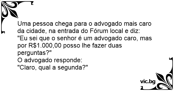 Uma pessoa chega para o advogado mais caro da cidade, na entrada do Fórum local e diz: