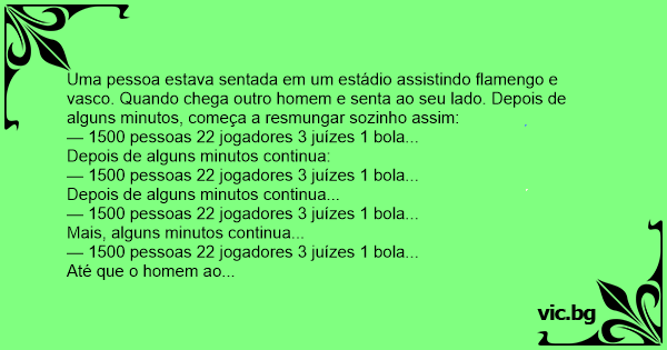 Uma pessoa estava sentada em um estádio assistindo flamengo e vasco. Quando chega outro homem e senta ao seu lado. Depois de alguns minutos, começa a resmungar sozinho assim: