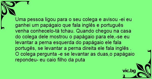Uma pessoa ligou para o seu colega e avisou -ei eu ganhei um papágaio que fala inglês e português venha conhecelo-tá tchau. Quando chegou na casa do colega dele mostrou o papágaio para ele,-se eu levantar a perna esquerda do papágaio ele fala portugês, se levantar a perna direita ele fala inglês . O colega pergunta -e se levantar as duas,o papágaio repondeu- eu caio filho da puta