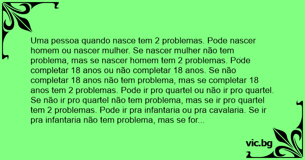 Uma pessoa quando nasce tem 2 problemas. Pode nascer homem ou nascer mulher. Se nascer mulher não tem problema, mas se nascer homem tem 2 problemas. Pode completar 18 anos ou não completar 18 anos. Se não completar 18 anos não tem problema, mas se completar 18 anos tem 2 problemas. Pode ir pro quartel ou não ir pro quartel. Se não ir pro quartel não tem problema, mas se ir pro quartel tem 2 problemas. Pode ir pra infantaria ou pra cavalaria. Se ir pra infantaria não tem problema, mas se for pra cavalaria tem 2 problemas. Pode montar o cavalo ou não montar o cavalo. Se não montar o cavalo não tem problema, mas se montar o cavalo tem 2 problemas. Pode cair do cavalo ou não cair do cavalo. Se não cair do cavalo não tem problema, mas se cair do cavalo tem 2 problemas. Pode machucar ou não machucar. Se não machucar não tem problema, mas se machucar tem 2 problemas. Pode ser grave ou não ser grave. Se não ser grave não tem problema, mas se ser grave tem 2 problemas. Pode ir pro hospitar ou não ir pro hospital. Se não ir pro hospital não tem problema, mas se ir pro hospital tem 2 problemas. Pode pegra infermeiro homem ou infermeira mulher. Se pegar infermeiro homem não tem problema, mas se pegar infermeira mulher tem 2 problemas. Pode ficar ou não ficar. Se não ficar não tem problema, mas se ficar tem 2 problemas. Pode ter filho ou não ter filho. Se não ter filho não tem problema, mas se tiver filho tem 2 problema. Pode nascer homem ou nascer mulher. Se nascer mulher não tem problema, mas se nascer homem tem 2 problemas. Pode completar 18 anos ou não completar 18 anos...