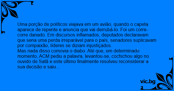Mas nada disso comovia o diabo. Até que, em determinado momento, ACM pediu a palavra, levantou-se, cochichou algo no ouvido de Satã e este último finalmente resolveu reconsiderar a sua decisão e saiu se desculpando.