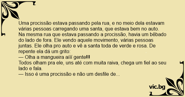 Uma procissão estava passando pela rua, e no meio dela estavam várias pessoas carregando uma santa, que estava bem no auto. Na mesma rua que estava passando a procissão, havia um bêbado do lado de fora. Ele vendo aquele movimento, várias pessoas juntas. Ele olha pro auto e vê a santa toda de verde e rosa. De repente ela dá um grito: