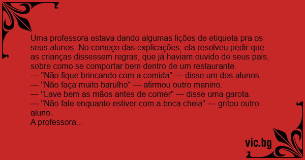 Uma professora estava dando algumas lições de etiqueta pra os seus alunos. No começo das explicações, ela resolveu pedir que as crianças dissessem regras, que já haviam ouvido de seus pais, sobre como se comportar bem dentro de um restaurante.