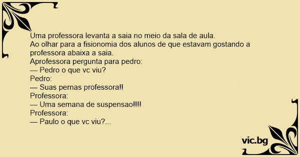 Ao olhar para a fisionomia dos alunos de que estavam gostando a professora abaixa a saia.