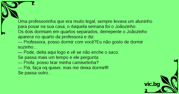 Os dois dormiam em quartos separados, derrepente o Joãozinho aparece no quarto da professora e diz: