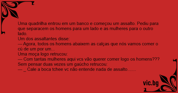 Uma quadrilha entrou em um banco e começou um assalto. Pediu para que separacem os homens para um lado e as mulheres para o outro lado.