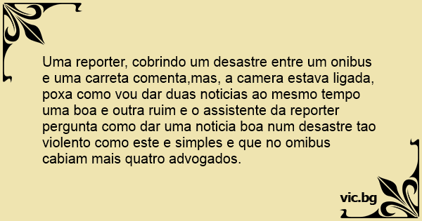 Uma reporter, cobrindo um desastre entre um onibus e uma carreta comenta,mas, a camera estava ligada, poxa como vou dar duas noticias ao mesmo tempo uma boa e outra ruim e o assistente da reporter pergunta como dar uma noticia boa num desastre tao violento como este e simples e que no omibus cabiam mais quatro advogados.