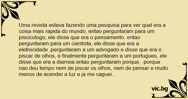 Uma revista estava fazendo uma pesquisa para ver qual era a coisa mais rapida do mundo, entao perguntaram para um piscicologo, ele disse que era o pensamento. entao perguntaram para um cientista, ele disse que era a eletrecidade ,perguntaram a um advogado e disse que era o piscar de olhos, e finalmente perguntaram a um portugues, ele disse que era a diarreia entao perguntaram porque, -porque nao deu tempo nem de piscar os olhos, nem de pensar e muito menos de acender a luz e ja me caguei inteiro.