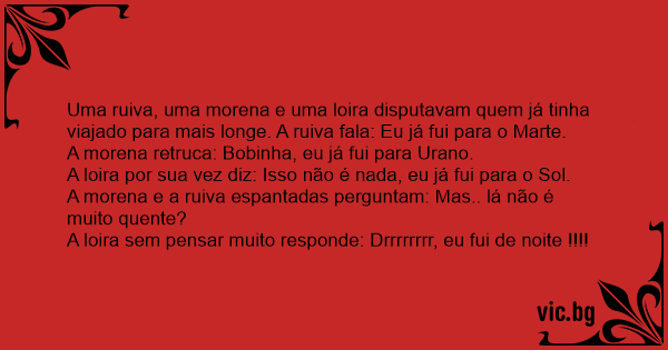 Uma ruiva, uma morena e uma loira disputavam quem já tinha viajado para mais longe. A ruiva fala: Eu já fui para o Marte.