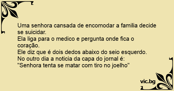 Uma senhora cansada de encomodar a familia decide se suicidar.