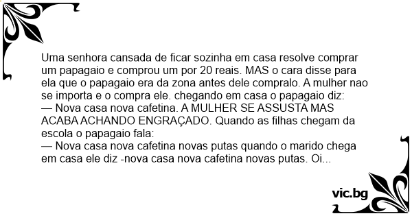 — Nova casa nova cafetina. A MULHER SE ASSUSTA MAS ACABA ACHANDO ENGRAÇADO. Quando as filhas chegam da escola o papagaio fala: