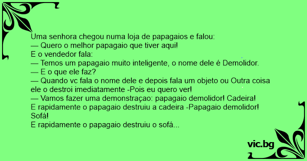 Quando ela chegou em casa encontrou o marido todo folgado Assistindo tv. Pensou logo em pedir ao papagaio para Destruir a tv, mas antes que fizesse isso o marido perguntou: