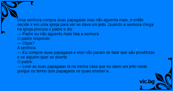 Uma senhora compra duas papagaias mas não aguenta mais, e então decide ir em uma igreja para ver se dava um jeito. Quando a senhora chega na igreja procura o padre e diz: