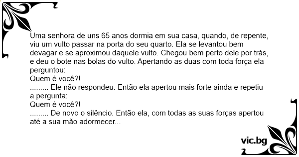 Uma senhora de uns 65 anos dormia em sua casa, quando, de repente, viu um vulto passar na porta do seu quarto. Ela se levantou bem devagar e se aproximou daquele vulto. Chegou bem perto dele por trás, e deu o bote nas bolas do vulto. Apertando as duas com toda força ela perguntou:
