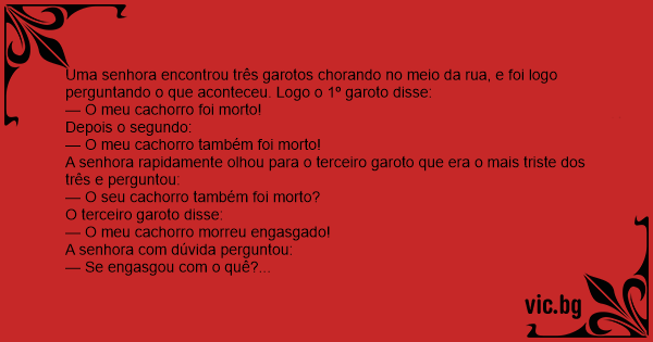 Uma senhora encontrou três garotos chorando no meio da rua, e foi logo perguntando o que aconteceu. Logo o 1º garoto disse: