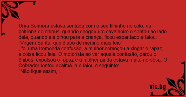Το πιο άσχημο μωρό The baby Το άσχημο μωρό Една жена се качила в автобус с бебето си. Шофьорът казал: В автобусе едет женщина с ребёнком.Заходит пьяный мужик: A woman gets on a bus with her baby. The bus driver says, "That's the ugliest baby that I've ever seen. Ugh!" Uma mulher entra no ônibus com seu filho e o motorista se espanta:,- Nossa, é o bebê mais feio que já vi!,A mulher ouve calada e senta na parte de trás do ônibus. Bufando, desabafa para outro passageiro:,- O motorista me insultou!,E o passageiro recomenda:,- Vá lá... I was walking home last night when I noticed an old drunk staggering along the road. He passed a woman who was walking a young child. "Lady", said the drunk, "that's the ugliest kid I've ever seen. Damn, that is one ugly child!." As the drunk wandered off, the lady burst into tears. Just then,... Wchodzi kobieta z czarnym dzieckiem na rękach do autobusu. - Fuj, jakie brzydkie dziecko - mówi kierowca autobusu. Kobieta oburzona, ba, wpieniona na maksa siada obok innego pasażera i mówi: - Słyszał pan? Jak tak można. Jaki niekulturalny, jaka... Kommt eine Frau mit ihrem Kind auf dem Arm in den Bus. Sagt der Busfahrer: "Mensch sie haben aber ein häßliches Kind!" Schockiert und immer noch verärgert setzt sich die Frau in den Bus. Ihr... På en buss i London satt en ung kvinna med sin baby i famnen när en berusad man klev på och stannade framför henne. Mannen tittade en lång stund på barnet och sa sedan så högt att alla i bussen... Met haar baby van zes dagen op de arm stapt Annie de bus in. "Dat is de lelijkste baby die ik ooit heb gezien!" zei de chauffeur, waarop Annie woedend achter in de bus plaatsneemt. De man naast... Annie stapt de bus in met haar pasgeboren baby op haar arm. Zegt de buschauffeur: 'Tering! Zo'n lelijk kind heb ik nog nooit gezien!' Annie wordt boos en gaat helemaal achterin de bus zitten. Een... En dame går på en buss med babyen sin. Bussjåføren sier: - Det er den styggeste babyen jeg noen gang har sett. Æsj!. Dama finner seg et sete og setter seg ned, mens hun furter. Hun snur seg til... O femeie cu un copil in brate se urca in autobuz. Soferul Zice: - Aoleu, asta e cel mai urit copil pe care l-am vazut Vreodata. Femeia Se duce in spatele autobuzului si se asaza pe scaun, Spumegind... Een vrouw staat samen met haar baby op de arm te wachten bij een bushalte. Als de bus aan komt en de vrouw instapt zegt de buschauffeur: "Dat is de lelijkste baby die ik ooit heb gezien!" De vrouw... En dame går på bussen med babyen sin, da bussjåføren utbryter: - «Det er den styggeste babyen jeg noen gang har sett. Æsj!» Damen går bak i bussen, setter seg ned og er rasende. «Sjåføren fornærmet... A woman got on a bus holding a baby. The bus driver looked at the child and blurted out, "That's the ugliest baby I've ever seen!" Infuriated, the woman slammed her fare into the fare box and took... Kadın bebeğiyle otobüse binerken otobüs şöförü kendini tutamayıp şöyle demiş: - Aman tanrım ne kadar çirkin bir bebek... Kadın sinirle biletini kutuya basmış, en arka tarafa geçmiş, bir adamın... A lady boards the bus with her baby. The bus driver looks at the baby and says "that's the ugliest thing I've ever seen!" The lady finds a seat and she is mad as hell. She tells the guy in the seat... A woman walks onto the Bus with his child. The driver says, "That’s the ugliest child I have seen!" The woman sits down and tells her neighbor. The neighbor replies, “Go say something back. Here,... En kvinde kommer ind i en bus med en baby på armen... Chaufføren kigger længe på ungen og udbryder: "Hold da kæft en grim unge" Kvinden sætter sig bagest i bussen, mens hun er ved at koge over af... Moteris su mažu vaiku įlipa į mikroautobusą. Vairuotojas imdamas pinigus, dėbteli į vaiką: - Nieko sau! Tokios baidyklės dar nematęs! Keleivė skubiai pereina į mikroautobuso galą ir susinervinus...