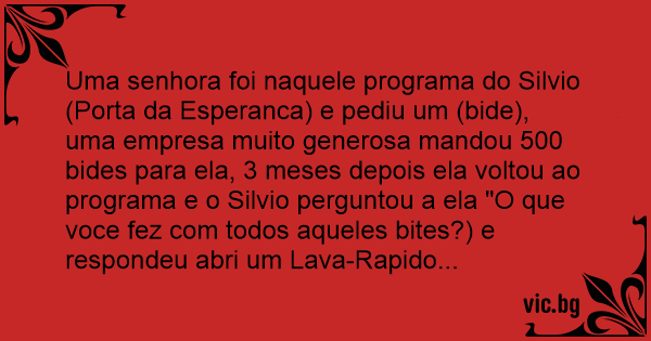 Uma senhora foi naquele programa do Silvio (Porta da Esperanca) e pediu um (bide), uma empresa muito generosa mandou 500 bides para ela, 3 meses depois ela voltou ao programa e o Silvio perguntou a ela "O que voce fez com todos aqueles bites?) e respondeu abri um Lava-Rapido...
