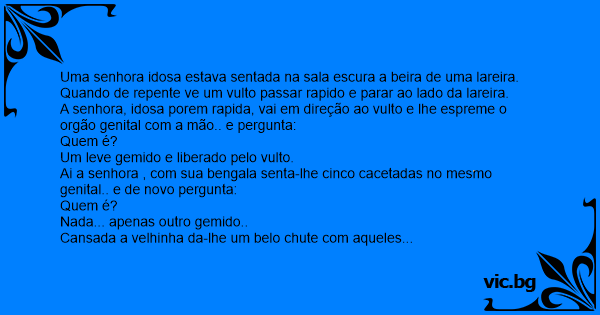 Ai a senhora , com sua bengala senta-lhe cinco cacetadas no mesmo genital.. e de novo pergunta: