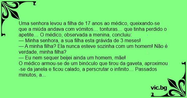 O médico armou-se de um binóculo que tirou da gaveta, aproximou-se da janela e ficou calado, a perscrutar o infinito… Passados minutos, a mãe, admirada e farta, perguntou ao médico o que se passava.