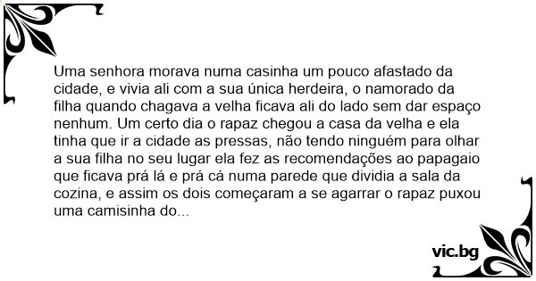 Uma senhora morava numa casinha um pouco afastado da cidade, e vivia ali com a sua única herdeira, o namorado da filha quando chagava a velha ficava ali do lado sem dar espaço nenhum. Um certo dia o rapaz chegou a casa da velha e ela tinha que ir a cidade as pressas, não tendo ninguém para olhar a sua filha no seu lugar ela fez as recomendações ao papagaio que ficava prá lá e prá cá numa parede que dividia a sala da cozina, e assim os dois começaram a se agarrar o rapaz puxou uma camisinha do bolso e mandou brasa; quando ele terminou arrancou a camisinha do раu e a arremeçou na parede, o papagaio vendo a cena disse: саrаlhо!! eu já vi fоdа na minha vida, mas prá sair o coro da рiса eu ainda não tinha visto não.