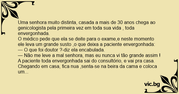 Uma senhora muito distinta, casada a mais de 30 anos chega ao genicologista pela primeira vez em toda sua vida , toda envergonhada.
