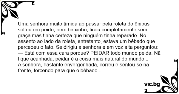 Uma senhora muito tímida ao passar pela roleta do ônibus soltou em реidо, bem baixinho, ficou completamente sem graça mas tinha certeza que ninguém tinha reparado. No assento ao lado da roleta, entretanto, estava um bêbado que percebeu o fato. Se dirigiu a senhora e em voz alta perguntou: