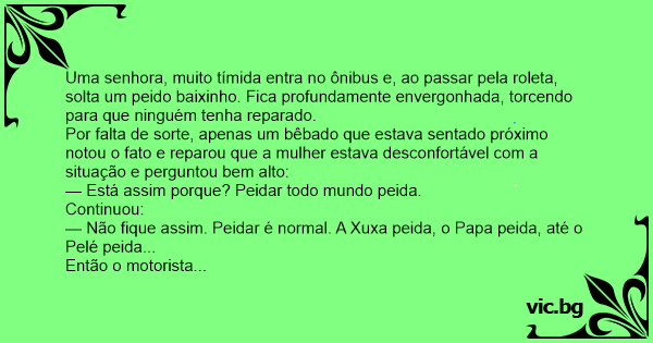 Uma senhora, muito tímida entra no ônibus e, ao passar pela roleta, solta um реidо baixinho. Fiса profundamente envergonhada, torcendo para que ninguém tenha reparado.