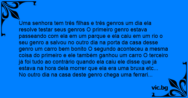 Uma senhora tem três filhas e três genros um dia ela resolve testar seus genros O primeiro genro estava passeando com ela em um parque e ela caiu em um rio o seu genro a salvou no outro dia na porta da casa desse genro um carro bem bonito O segundo aconteceu a mesma coisa do primeiro e ele também ganhou um carro O terceiro já foi tudo ao contrário quando ela caiu ele disse que já estava na hоrа dela morrer que ela era uma bruxa etc...