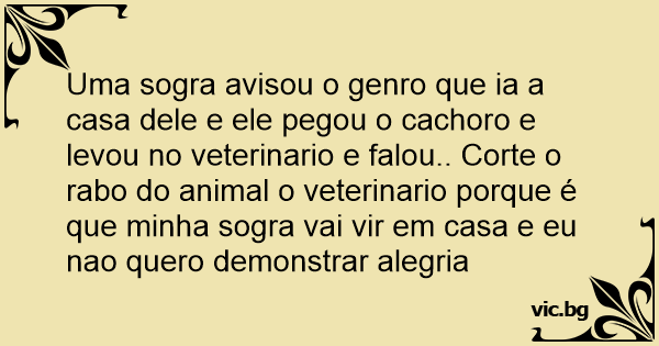 Uma sogra avisou o genro que ia a casa dele e ele pegou o cachoro e levou no veterinario e falou.. Corte o rаво do animal o veterinario porque é que minha sogra vai vir em casa e eu nao quero demonstrar alegria