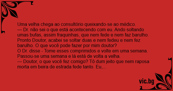 — Dr. não sei o que está acontecendo com eu. Ando soltando umas bufas, assim fraquinhas, que nem fede e nem faz barulho. Pronto Doutor, acabei se soltar duas e nem fedeu e nem fez barulho. O que você pode fazer por mim doutor?