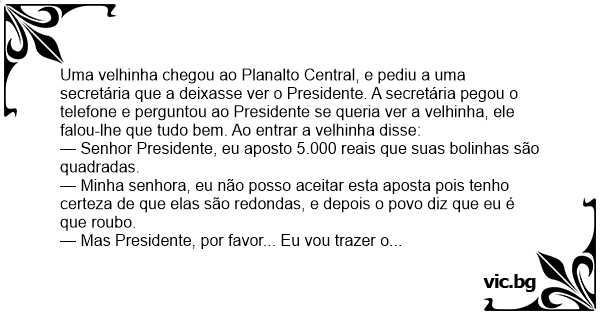 Uma velhinha chegou ao Planalto Central, e pediu a uma secretária que a deixasse ver o Presidente. A secretária pegou o telefone e perguntou ao Presidente se queria ver a velhinha, ele falou-lhe que tudo bem. Ao entrar a velhinha disse:
