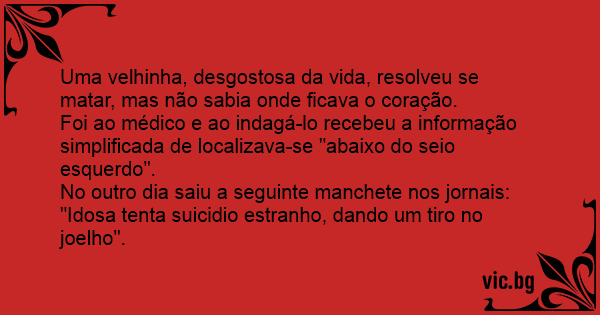 Uma velhinha, desgostosa da vida, resolveu se matar, mas não sabia onde ficava o coração.