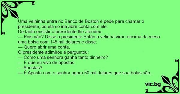 Uma velhinha entra no Banco de Boston e pede para chamar o presidente, pq ela só iria abrir conta com ele.