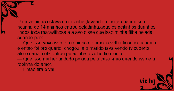 — Que isso vovo isso e a ropinha do amor a velha ficou incucada a e entao foi pro quarto, chogou la o marido tava vendo tv cuberto ate o nariz e ela entrou peladinha o velho fico louco .