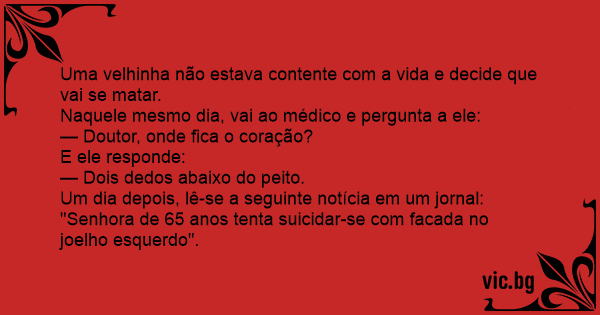 Uma velhinha não estava contente com a vida e decide que vai se matar.