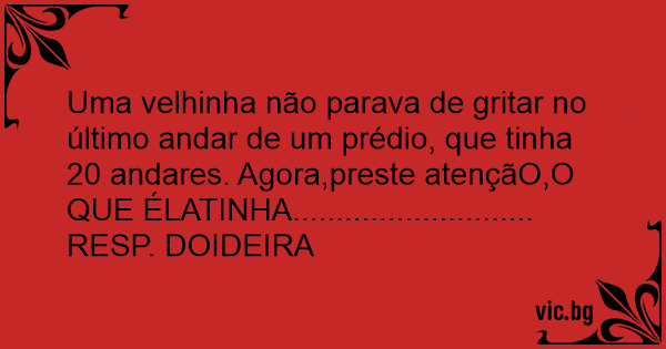 Uma velhinha não parava de gritar no último andar de um prédio, que tinha 20 andares. Agora,preste atençãO,O QUE ÉLATINHA............................ RESP. DOIDEIRA