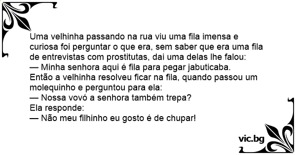 Uma velhinha passando na rua viu uma fila imensa e curiosa foi perguntar o que era, sem saber que era uma fila de entrevistas com prostitutas, dai uma delas lhe falou: