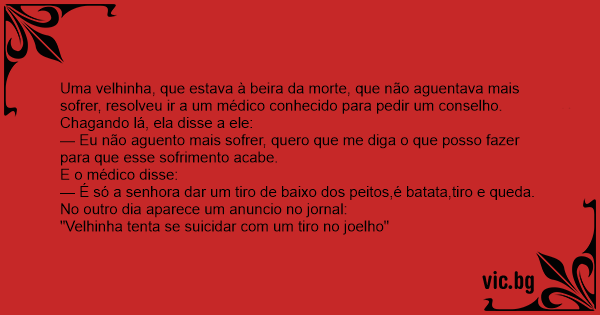 Uma velhinha, que estava à beira da morte, que não aguentava mais sofrer, resolveu ir a um médico conhecido para pedir um conselho.