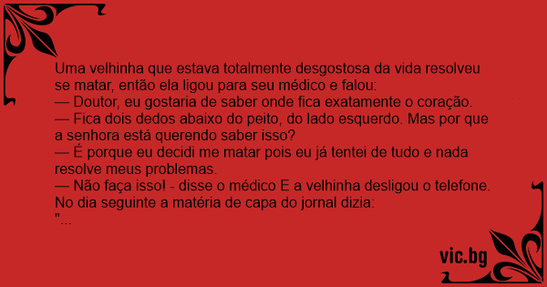 Uma velhinha que estava totalmente desgostosa da vida resolveu se matar, então ela ligou para seu médico e falou: